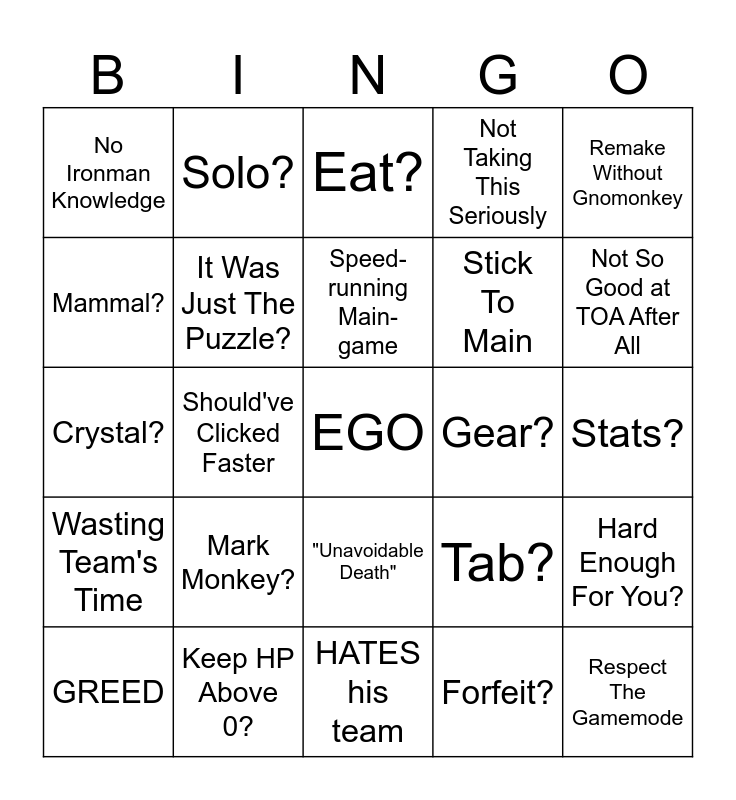 This bingo card has a free space and 24 words: Mark Monkey?, Keep HP Above 0?, Speed-running Main-game, GREED, Remake Without Gnomonkey, No Ironman Knowledge, Mammal?, Solo?, Gear?, "Unavoidable Death", Stick To Main, Crystal?, Tab?, Hard Enough For You?, It Was Just The Puzzle?, Forfeit?, Stats?, Eat?, Not So Good at TOA After All, Should've Clicked Faster, Respect The Gamemode, Wasting Team's Time, Not Taking This Seriously and HATES his team.