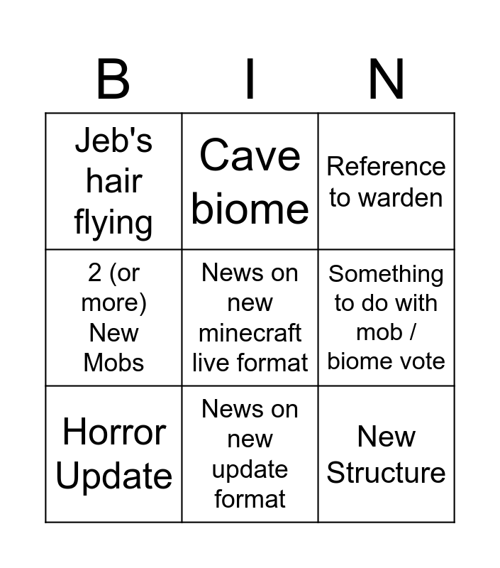 This bingo card has 9 words: Horror Update, Reference to warden, Cave biome, 2 (or more) New Mobs, Jeb's hair flying, Something to do with mob / biome vote, News on new minecraft live format, New Structure and News on new update format.