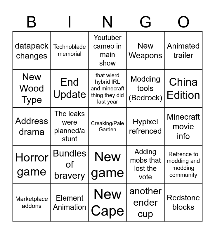 This bingo card has a free space and 24 words: Bundles of bravery, Element Animation, that wierd hybrid IRL and minecraft thing they did last year, Marketplace addons, Animated trailer, datapack changes, New Wood Type, Technoblade memorial, Hypixel refrenced, New game, Modding tools (Bedrock), Address drama, Adding mobs that lost the vote, Refrence to modding and modding community, End Update, another ender cup, Minecraft movie info, Youtuber cameo in main show, China Edition, The leaks were planned/a stunt, Redstone blocks, Horror game, New Weapons and New Cape.