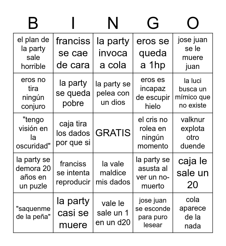 This bingo card has a free space and 24 words: franciss se intenta reproducir, la party casi se muere, la party se pelea con un dios, "saquenme de la peña", jose juan se le muere juan, el plan de la party sale horrible, eros no tira ningún conjuro, franciss se cae de cara, el cris no rolea en ningún momento, la vale maldice mis dados, eros es incapaz de escupir hielo, "tengo visión en la oscuridad", la party se asusta al ver un no-muerto, caja le sale un 20, la party se queda pobre, jose juan se esconde para puro lesear, valknur explota otro duende, la party invoca a cola, la luci busca un mímico que no existe, caja tira los dados por que si, cola aparece de la nada, la party se demora 20 años en un puzle, eros se queda a 1hp and vale le sale un 1 en un d20.
