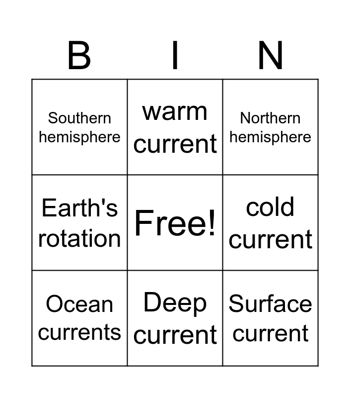 This bingo card has a free space and 9 words: Ocean currents, warm current, cold current, Southern hemisphere, Northern hemisphere, Earth's rotation, Deep current, Surface current and Planetary Wind.