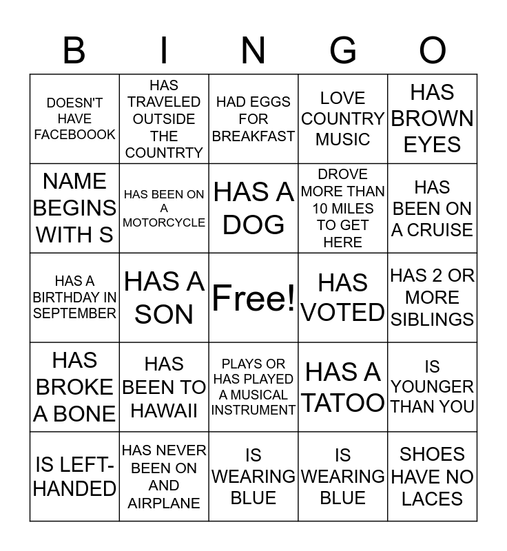This bingo card has a free space and 24 words: HAS BEEN TO HAWAII, HAS NEVER BEEN ON AND AIRPLANE, HAS A DOG, IS LEFT-HANDED, HAS BROWN EYES, DOESN'T HAVE FACEBOOOK, NAME BEGINS WITH S, HAS TRAVELED OUTSIDE THE COUNTRTY, HAS VOTED, PLAYS OR HAS PLAYED A MUSICAL INSTRUMENT, DROVE MORE THAN 10 MILES TO GET HERE, HAS A BIRTHDAY IN SEPTEMBER, HAS A TATOO, IS YOUNGER THAN YOU, HAS BEEN ON A MOTORCYCLE, IS WEARING BLUE, HAS 2 OR MORE SIBLINGS, HAD EGGS FOR BREAKFAST, HAS BEEN ON A CRUISE, HAS A SON, SHOES HAVE NO LACES, HAS BROKE A BONE, LOVE COUNTRY MUSIC and IS WEARING BLUE.
