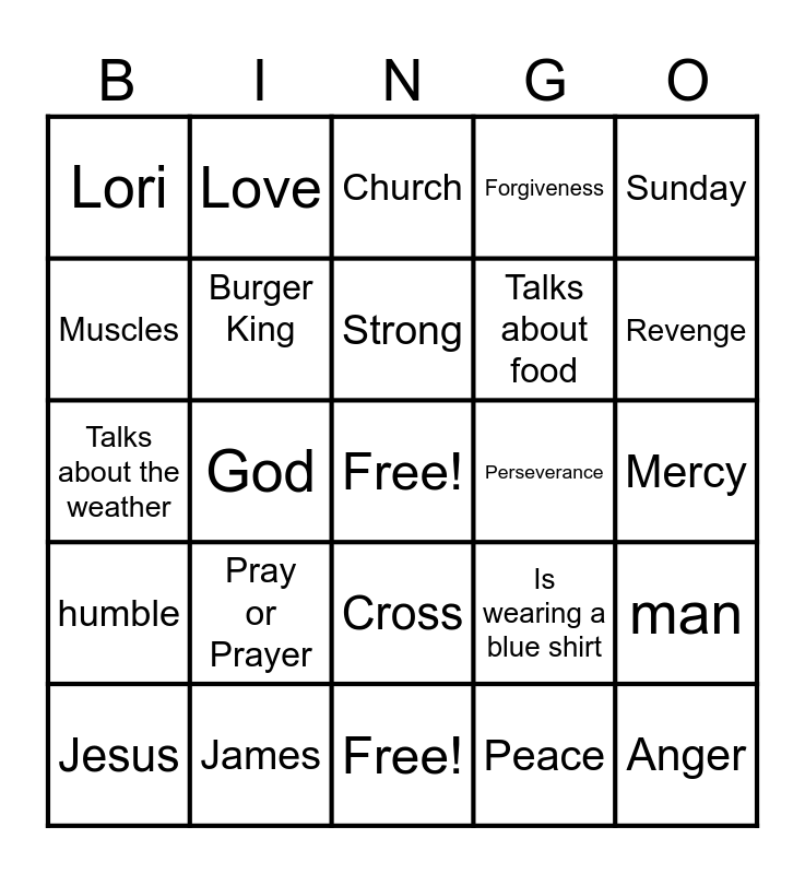 This bingo card has a free space and 24 words: Pray or Prayer, James, Strong, Jesus, Sunday, Lori, Muscles, Love, Perseverance, Cross, Talks about food, Talks about the weather, Is wearing a blue shirt, man, Burger King, Peace, Mercy, Church, Revenge, God, Anger, humble, Forgiveness and Free!.