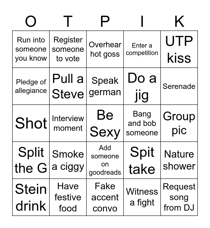 This bingo card has a free space and 24 words: Smoke a ciggy, Have festive food, Speak german, Stein drink, UTP kiss, Run into someone you know, Pledge of allegiance, Register someone to vote, Bang and bob someone, Add someone on goodreads, Do a jig, Shot, Spit take, Nature shower, Pull a Steve, Witness a fight, Group pic, Overhear hot goss, Serenade, Interview moment, Request song from DJ, Split the G, Enter a competition and Fake accent convo.