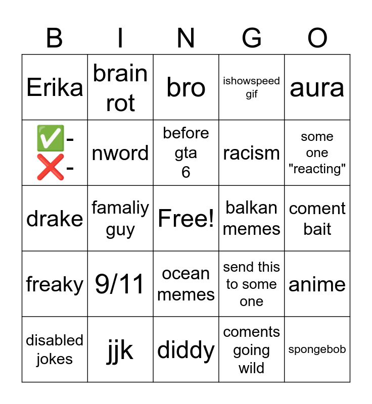 This bingo card has a free space and 24 words: 9/11, jjk, before gta 6, disabled jokes, aura, Erika, ✅- ❌-, brain rot, balkan memes, ocean memes, racism, drake, send this to some one, anime, nword, coments going wild, coment bait, bro, some one "reacting", famaliy guy, spongebob, freaky, ishowspeed gif and diddy.