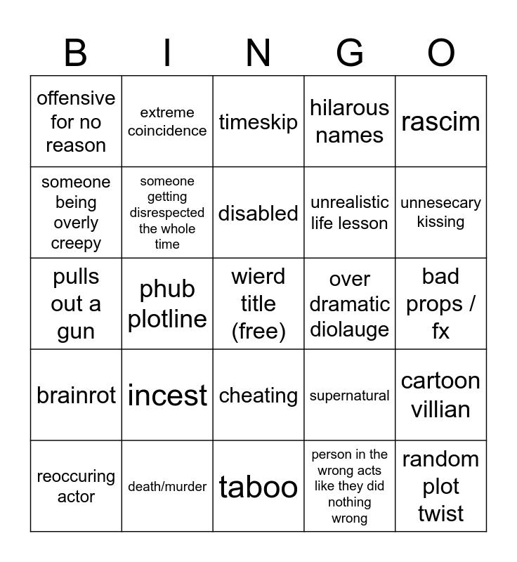 This bingo card has a free space and 24 words: incest, death/murder, disabled, reoccuring actor, rascim, offensive for no reason, someone being overly creepy, extreme coincidence, over dramatic diolauge, cheating, unrealistic life lesson, pulls out a gun, supernatural, cartoon villian, someone getting disrespected the whole time, person in the wrong acts like they did nothing wrong, bad props / fx, timeskip, unnesecary kissing, phub plotline, random plot twist, brainrot, hilarous names and taboo.