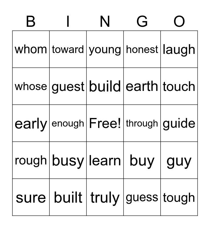 This bingo card has a free space and 24 words: busy, built, build, sure, laugh, whom, whose, toward, through, learn, earth, early, buy, guy, guest, guess, guide, young, touch, enough, tough, rough, honest and truly.