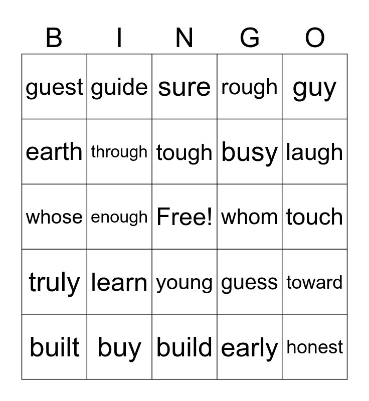 This bingo card has a free space and 24 words: learn, buy, tough, built, guy, guest, earth, guide, whom, young, busy, whose, guess, toward, through, early, touch, sure, laugh, enough, honest, truly, rough and build.
