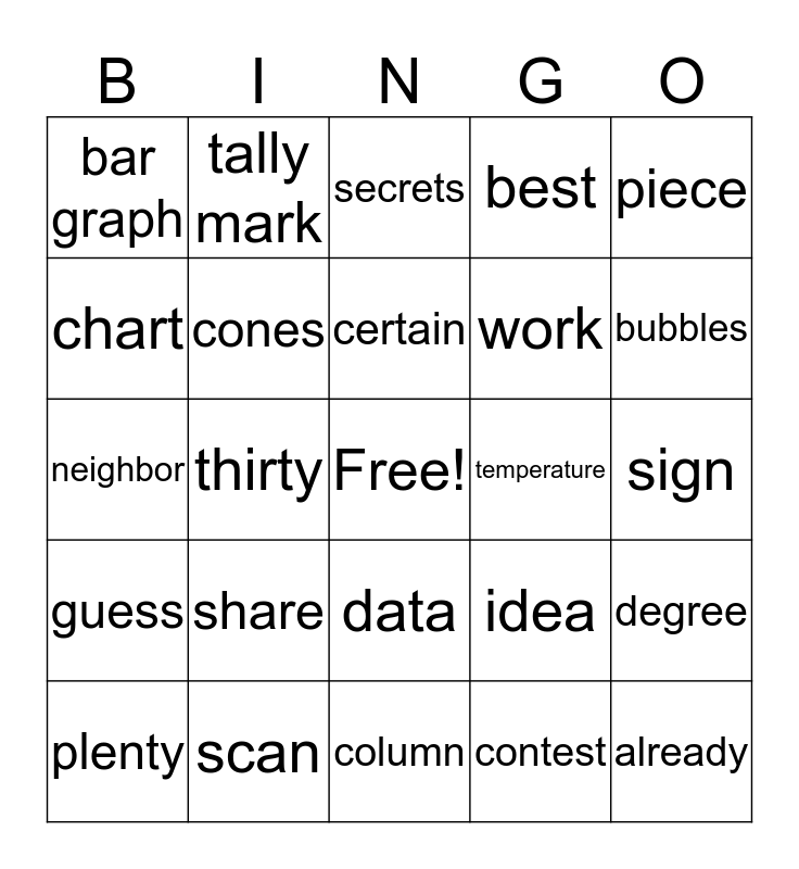 This bingo card has a free space and 24 words: share, scan, certain, plenty, piece, bar graph, chart, tally mark, temperature, data, work, neighbor, idea, degree, cones, contest, sign, secrets, bubbles, thirty, already, guess, best and column.