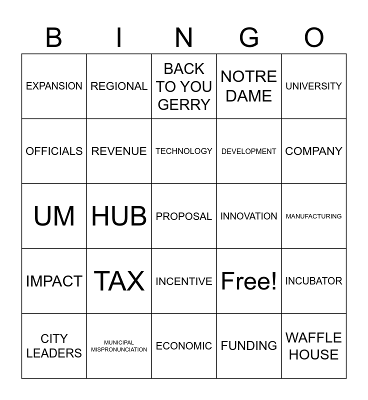 This bingo card has 25 words: TAX, ECONOMIC, TECHNOLOGY, CITY LEADERS, UNIVERSITY, EXPANSION, OFFICIALS, REGIONAL, INNOVATION, INCENTIVE, DEVELOPMENT, UM, Free!, INCUBATOR, REVENUE, WAFFLE HOUSE, MANUFACTURING, BACK TO YOU GERRY, COMPANY, HUB, PROPOSAL, MUNICIPAL MISPRONUNCIATION, IMPACT, NOTRE DAME and FUNDING.