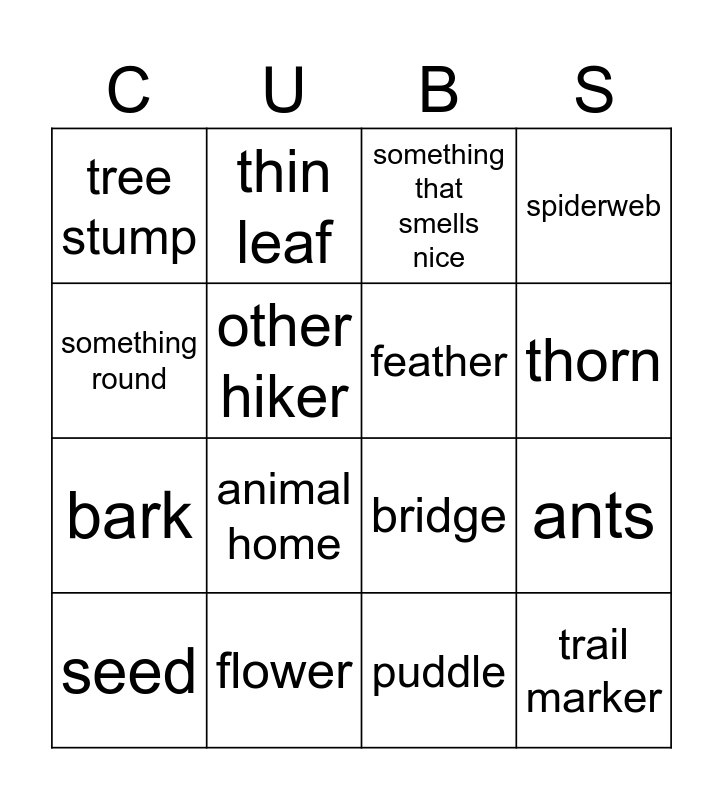This bingo card has 16 words: flower, ants, something that smells nice, tree stump, bark, thin leaf, bridge, puddle, something round, other hiker, seed, spiderweb, animal home, thorn, feather and trail marker.