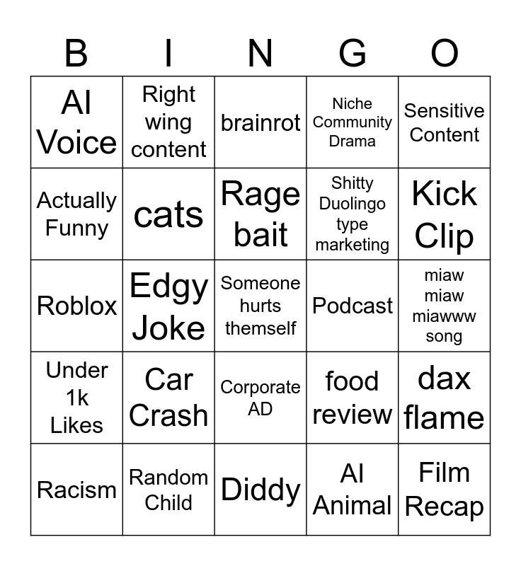 This bingo card has a free space and 24 words: Car Crash, Random Child, Rage bait, Racism, Sensitive Content, AI Voice, Actually Funny, Right wing content, Podcast, Corporate AD, Shitty Duolingo type marketing, Roblox, food review, dax flame, cats, AI Animal, miaw miaw miawww song, brainrot, Kick Clip, Edgy Joke, Film Recap, Under 1k Likes, Niche Community Drama and Diddy.