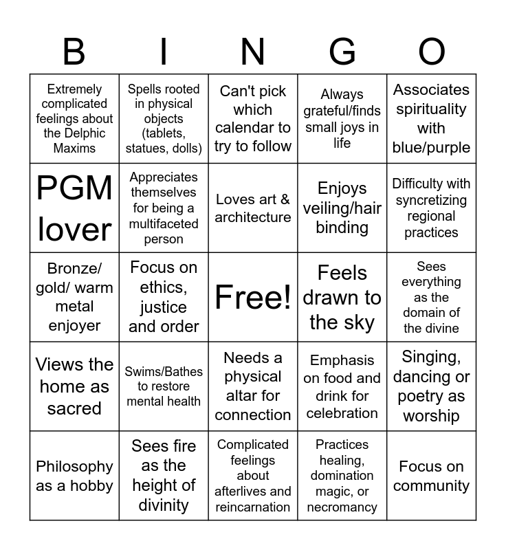 This bingo card has a free space and 24 words: Swims/Bathes to restore mental health, Sees fire as the height of divinity, Loves art & architecture, Philosophy as a hobby, Associates spirituality with blue/purple, Extremely complicated feelings about the Delphic Maxims, PGM lover, Spells rooted in physical objects (tablets, statues, dolls), Feels drawn to the sky, Needs a physical altar for connection, Enjoys veiling/hair binding, Bronze/ gold/ warm metal enjoyer, Emphasis on food and drink for celebration, Singing, dancing or poetry as worship, Appreciates themselves for being a multifaceted person, Practices healing, domination magic, or necromancy, Sees everything as the domain of the divine, Can't pick which calendar to try to follow, Difficulty with syncretizing regional practices, Focus on ethics, justice and order, Focus on community, Views the home as sacred, Always grateful/finds small joys in life and Complicated feelings about afterlives and reincarnation.