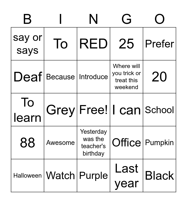 This bingo card has a free space and 24 words: Awesome, Watch, Introduce, Halloween, Prefer, say or says, Deaf, To, I can, Yesterday was the teacher's birthday, Where will you trick or treat this weekend, To learn, Office, Pumpkin, Because, Last year, School, RED, 20, Grey, Black, 88, 25 and Purple.