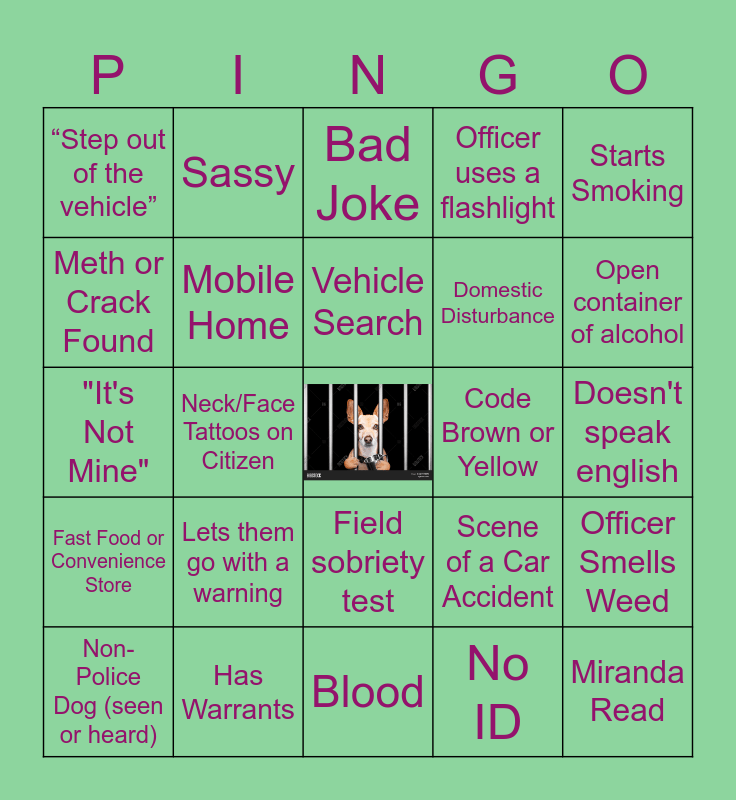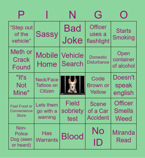 This bingo card has a free space and 52 words: Crying, Miranda Read, Lights on to Commercial, Blood, Lets them go with a warning, Handcuffed, Sassy, Shirtless and/or Pantsless, Meth or Crack Found, Substance tested, Mobile Home, Pajamas, Officer Smells Weed, Scene of a Car Accident, Cop Running or Jogging, 5 or More Beeps, Vehicle Search, Code Brown or Yellow, Drunk, Starts Smoking, Neck/Face Tattoos on Citizen, No ID, “Step out of the vehicle”, Domestic Disturbance, Cop Gun Drawn, Street Lawyer, Citizen talks directly to camera, “Bro(ther)/ Bud(dy) / Chief / Boss", Open container of alcohol, It's after midnight and I've been awake for the whole show!, K9 deployed (drugs or search), Officer uses a flashlight, Kid(s) in Car, Plates either: missing / expired / or on wrong car, Car Chase, Bad Joke, Has Warrants, Resisting Arrest, Bicycle or moped, Outdoor Party, Someone barefoot, Doesn't speak english, Fast Food or Convenience Store, Gun Found, Field sobriety test, Knife Incident or Knife Found, "Anyone Hurt/Need medical attention/ Ambulance", "It's Not Mine", Asked/Wants to Press Charges, Dancing/ Twerking, Non-Police Dog (seen or heard) and Cops asks for ID.