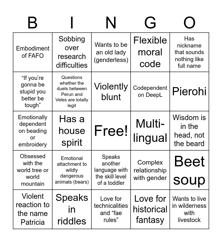 This bingo card has a free space and 24 words: Emotional attachment to wildly dangerous animals (bears), Speaks in riddles, Violently blunt, Violent reaction to the name Patricia, Has nickname that sounds nothing like full name, Embodiment of FAFO, “If you’re gonna be stupid you better be tough”, Sobbing over research difficulties, Multi-lingual, Speaks another language with the skill level of a toddler, Codependent on DeepL, Emotionally dependent on beading or embroidery, Complex relationship with gender, Beet soup, Questions whether the duels between Perun and Veles are totally legit, Love for historical fantasy, Wisdom is in the head, not the beard, Wants to be an old lady (genderless), Pierohi, Has a house spirit, Wants to live in wilderness with livestock, Obsessed with the world tree or world mountain, Flexible moral code and Love for technicalities and “fae rules”.