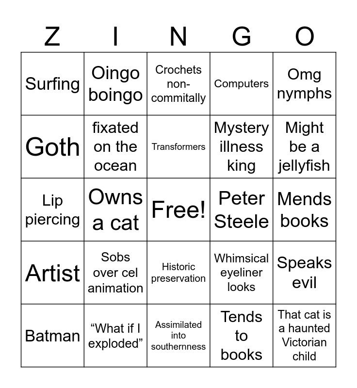 This bingo card has a free space and 24 words: Sobs over cel animation, “What if I exploded”, Transformers, Batman, Omg nymphs, Surfing, Goth, Oingo boingo, Peter Steele, Historic preservation, Mystery illness king, Lip piercing, Whimsical eyeliner looks, Speaks evil, fixated on the ocean, Tends to books, Mends books, Crochets non-commitally, Might be a jellyfish, Owns a cat, That cat is a haunted Victorian child, Artist, Computers and Assimilated into southernness.