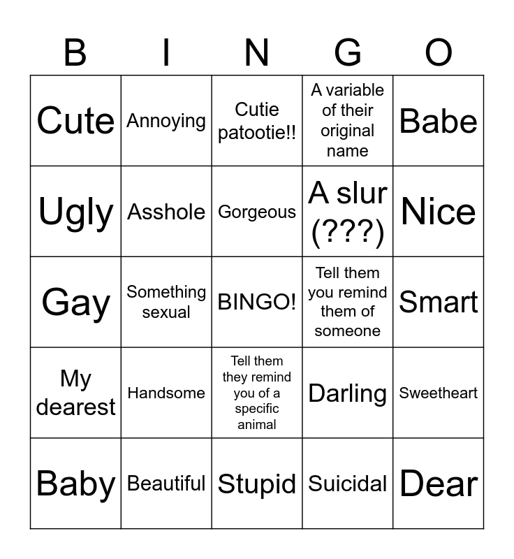 This bingo card has a free space and 24 words: Handsome, Beautiful, Gorgeous, Baby, Babe, Cute, Ugly, Annoying, Tell them you remind them of someone, Tell them they remind you of a specific animal, A slur (???), Gay, Darling, Sweetheart, Asshole, Suicidal, Smart, Cutie patootie!!, Nice, Something sexual, Dear, My dearest, A variable of their original name and Stupid.