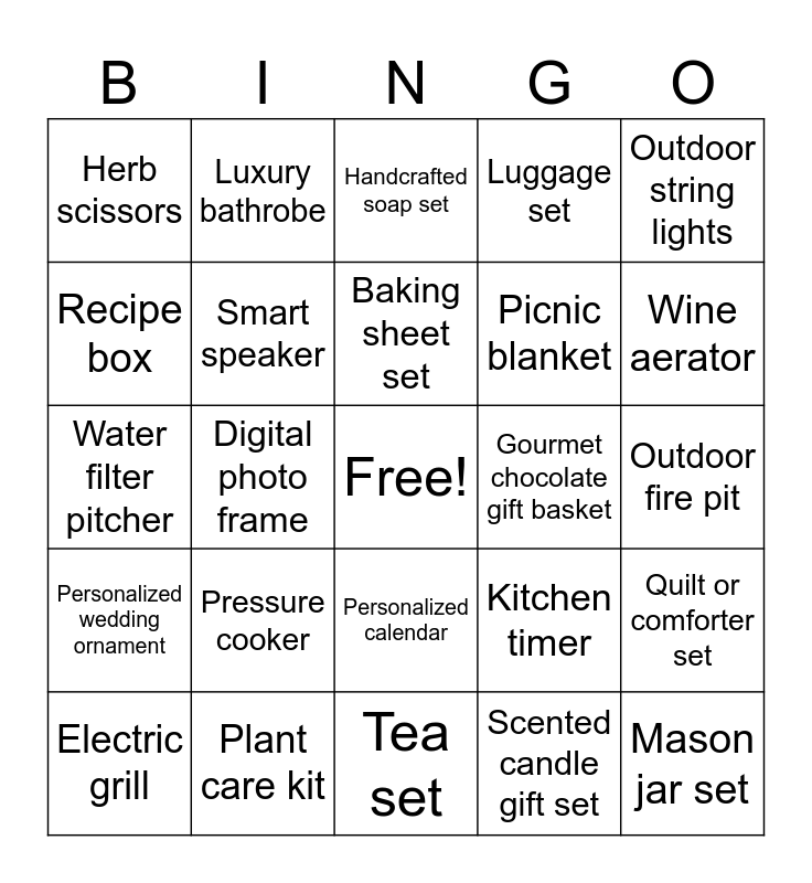 This bingo card has a free space and 25 words: Pressure cooker, Tea set, Baking sheet set, Electric grill, Outdoor string lights, Herb scissors, Recipe box, Luxury bathrobe, Gourmet chocolate gift basket, Personalized calendar, Picnic blanket, Water filter pitcher, Kitchen timer, Quilt or comforter set, Smart speaker, Travel scratch-off map, Outdoor fire pit, Handcrafted soap set, Wine aerator, Digital photo frame, Mason jar set, Plant care kit, Personalized wedding ornament, Luggage set and Scented candle gift set.