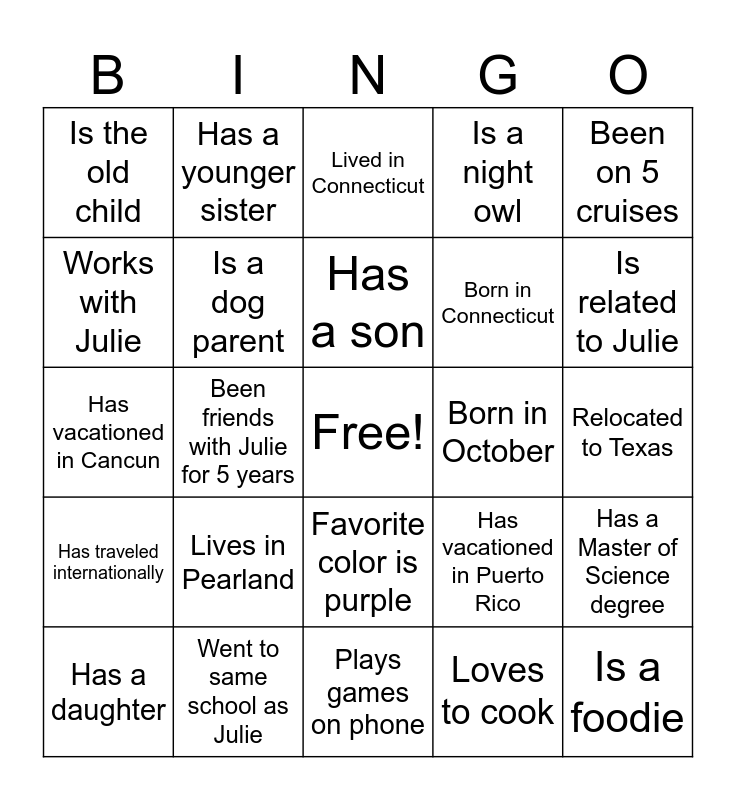 This bingo card has a free space and 24 words: Lives in Pearland, Went to same school as Julie, Has a son, Has a daughter, Been on 5 cruises, Is the old child, Works with Julie, Has a younger sister, Born in October, Favorite color is purple, Born in Connecticut, Has vacationed in Cancun, Has vacationed in Puerto Rico, Has a Master of Science degree, Is a dog parent, Loves to cook, Relocated to Texas, Lived in Connecticut, Is related to Julie, Been friends with Julie for 5 years, Is a foodie, Has traveled internationally, Is a night owl and Plays games on phone.