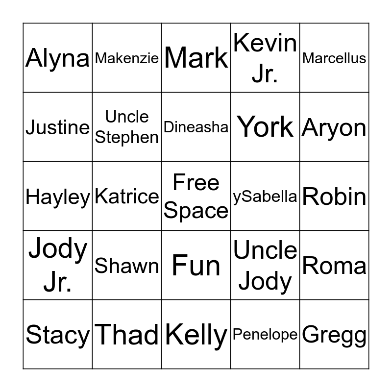 This bingo card has a free space and 36 words: Wright, Doll, Uncle Kevin, Uncle Stephen, Uncle Jody, Jody Jr., Dineasha, Shavonne, Marcellus, Emani, Katrice, Kevin Jr., Stephen Jr., ySabella, Aryon, Alyna, Ahmir, Shawn, Gregg, Mark, Robin, Roma, Thad, Stacy, Kelly, Makenzie, Hayley, Jack, York, Justine, Heather, Zachary, Penelope, Fun, Laugh and Picnic.