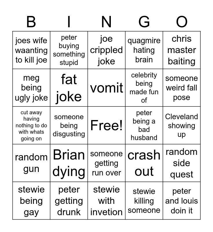 This bingo card has a free space and 24 words: Brian dying, peter getting drunk, vomit, stewie being gay, chris master baiting, joes wife waanting to kill joe, meg being ugly joke, peter buying something stupid, peter being a bad husband, someone getting run over, celebrity being made fun of, cut away having nothing to do with whats going on, crash out, random side quest, fat joke, stewie killing someone, Cleveland showing up, joe crippled joke, someone weird fall pose, someone being disgusting, peter and louis doin it, random gun, quagmire hating brain and stewie with invetion.