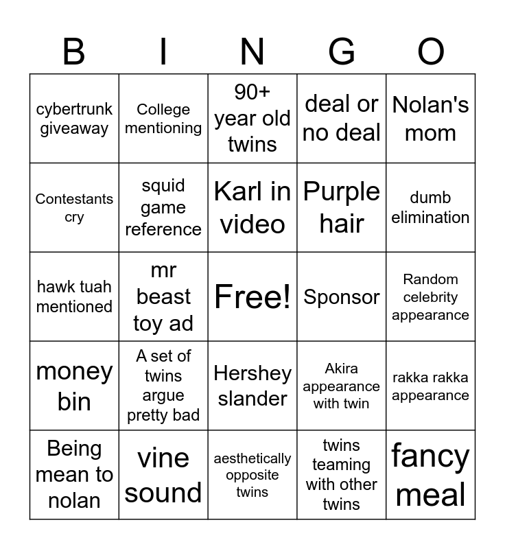 This bingo card has a free space and 24 words: A set of twins argue pretty bad, vine sound, Karl in video, Being mean to nolan, Nolan's mom, cybertrunk giveaway, Contestants cry, College mentioning, Sponsor, Hershey slander, Purple hair, hawk tuah mentioned, Akira appearance with twin, rakka rakka appearance, squid game reference, twins teaming with other twins, Random celebrity appearance, 90+ year old twins, dumb elimination, mr beast toy ad, fancy meal, money bin, deal or no deal and aesthetically opposite twins.