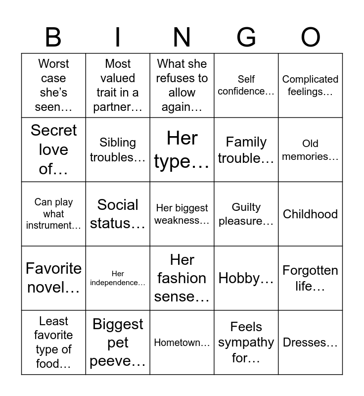 This bingo card has 25 words: Favorite novel…, Biggest pet peeve…, Her biggest weakness…, Feels sympathy for…, Complicated feelings…, Worst case she’s seen…, Most valued trait in a partner…, What she refuses to allow again…, Guilty pleasure…, Forgotten life…, Secret love of…, Sibling troubles…, Hometown…, Hobby…, Old memories…, Least favorite type of food…, Social status…, Her type…, Family trouble…, Childhood, Can play what instrument…, Her independence…, Her fashion sense…, Self confidence… and Dresses….