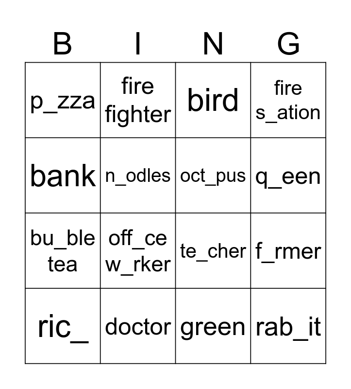 This bingo card has 16 words: doctor, f_rmer, bird, p_zza, bu_ble tea, fire fighter, te_cher, green, bank, n_odles, ric_, fire s_ation, off_ce w_rker, q_een, oct_pus and rab_it.