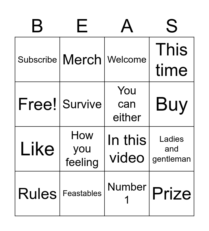 This bingo card has 16 words: Feastables, Ladies and gentleman, Welcome, Subscribe, Like, Merch, In this video, Number 1, Free!, Survive, Rules, This time, How you feeling, Buy, You can either and Prize.