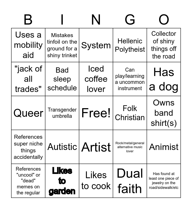 This bingo card has a free space and 24 words: Autistic, Likes to garden, Iced coffee lover, References "uncool" or "dead" memes on the regular, Collector of shiny things off the road, Uses a mobility aid, "jack of all trades", Mistakes tinfoil on the ground for a shiny trinket, Folk Christian, Artist, Can play/learning a uncommon instrument, Queer, Rock/metal/general alternative music lover, Animist, Bad sleep schedule, Dual faith, Owns band shirt(s), System, Has a dog, Transgender umbrella, Has found at least one piece of jewelry on the road/sidewalk/etc, References super niche things accidentally, Hellenic Polytheist and Likes to cook.
