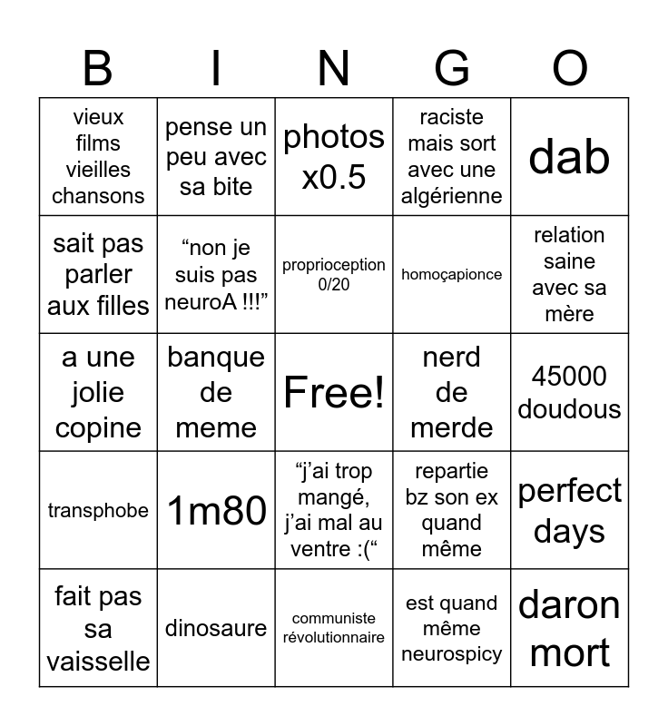 This bingo card has a free space and 24 words: 1m80, dinosaure, proprioception 0/20, fait pas sa vaisselle, dab, vieux films vieilles chansons, sait pas parler aux filles, pense un peu avec sa bite, nerd de merde, “j’ai trop mangé, j’ai mal au ventre :(“, homoçapionce, a une jolie copine, repartie bz son ex quand même, perfect days, “non je suis pas neuroA !!!”, est quand même neurospicy, 45000 doudous, photos x0.5, relation saine avec sa mère, banque de meme, daron mort, transphobe, raciste mais sort avec une algérienne and communiste révolutionnaire.