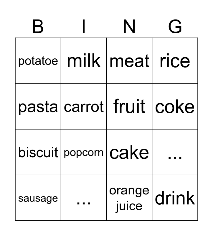 This bingo card has 16 words: ..., ..., meat, potatoe, biscuit, milk, cake, orange juice, pasta, carrot, sausage, rice, popcorn, coke, fruit and drink.