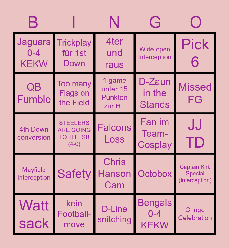 This bingo card has 25 words: Safety, D-Line snitching, 1 game unter 15 Punkten zur HT, Watt sack, Pick 6, Jaguars 0-4 KEKW, QB Fumble, Trickplay für 1st Down, Fan im Team-Cosplay, Chris Hanson Cam, D-Zaun in the Stands, 4th Down conversion, Octobox, Captain Kirk Special (Interception), Too many Flags on the Field, Cringe Celebration, JJ TD, 4ter und raus, Missed FG, STEELERS ARE GOING TO THE SB (4-0), Falcons Loss, kein Football-move, Mayfield Interception, Wide-open Interception and Bengals 0-4 KEKW.