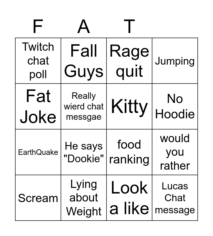 This bingo card has 16 words: Lying about Weight, would you rather, Rage quit, Twitch chat poll, EarthQuake, Fall Guys, food ranking, Look a like, Fat Joke, Really wierd chat messgae, Scream, Jumping, He says "Dookie", No Hoodie, Kitty and Lucas Chat message.