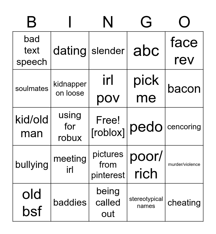 This bingo card has a free space and 24 words: meeting irl, baddies, irl pov, old bsf, face rev, bad text speech, soulmates, dating, pedo, pictures from pinterest, pick me, kid/old man, poor/ rich, murder/violence, kidnapper on loose, stereotypical names, cencoring, slender, bacon, using for robux, cheating, bullying, abc and being called out.