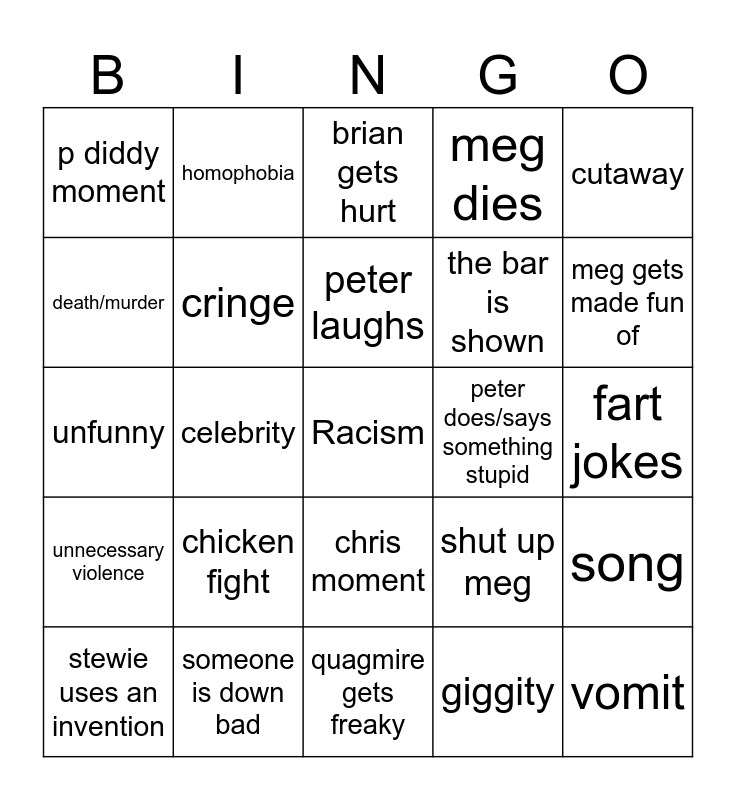 This bingo card has a free space and 24 words: chicken fight, someone is down bad, peter laughs, stewie uses an invention, cutaway, p diddy moment, death/murder, homophobia, peter does/says something stupid, chris moment, the bar is shown, unfunny, shut up meg, song, cringe, giggity, fart jokes, brian gets hurt, meg gets made fun of, celebrity, vomit, unnecessary violence, meg dies and quagmire gets freaky.