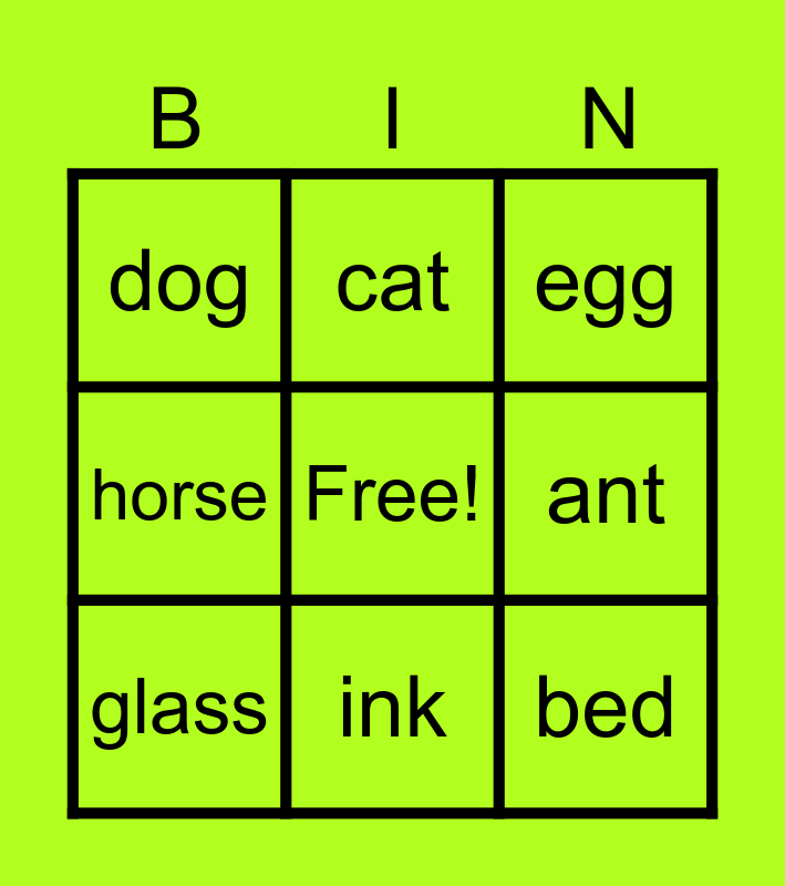 This bingo card has a free space and 8 words: ant, egg, cat, glass, dog, bed, horse and ink.