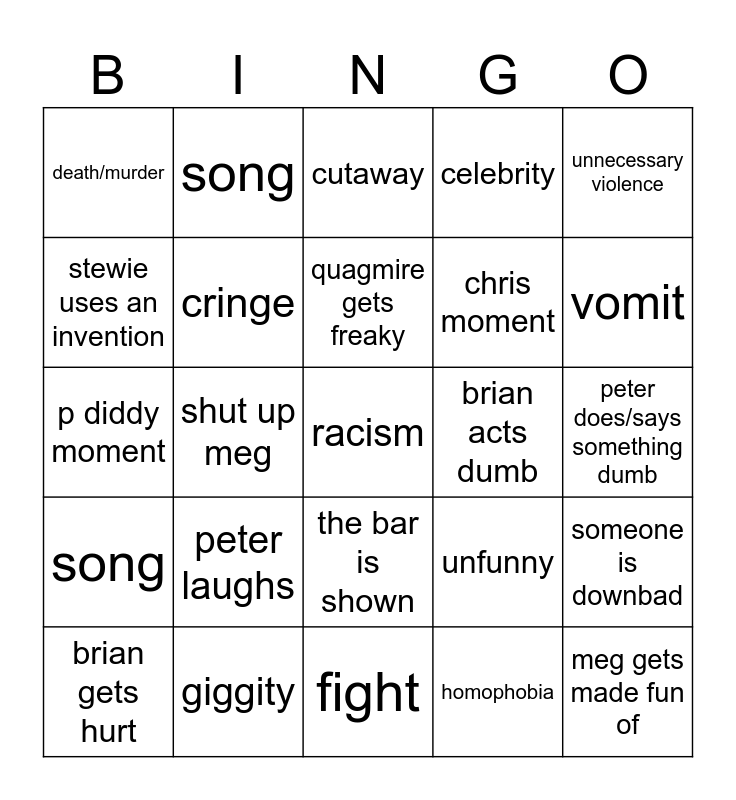 This bingo card has a free space and 24 words: peter laughs, giggity, quagmire gets freaky, brian gets hurt, unnecessary violence, death/murder, stewie uses an invention, song, brian acts dumb, the bar is shown, chris moment, p diddy moment, unfunny, someone is downbad, cringe, homophobia, peter does/says something dumb, cutaway, vomit, shut up meg, meg gets made fun of, song, celebrity and fight.
