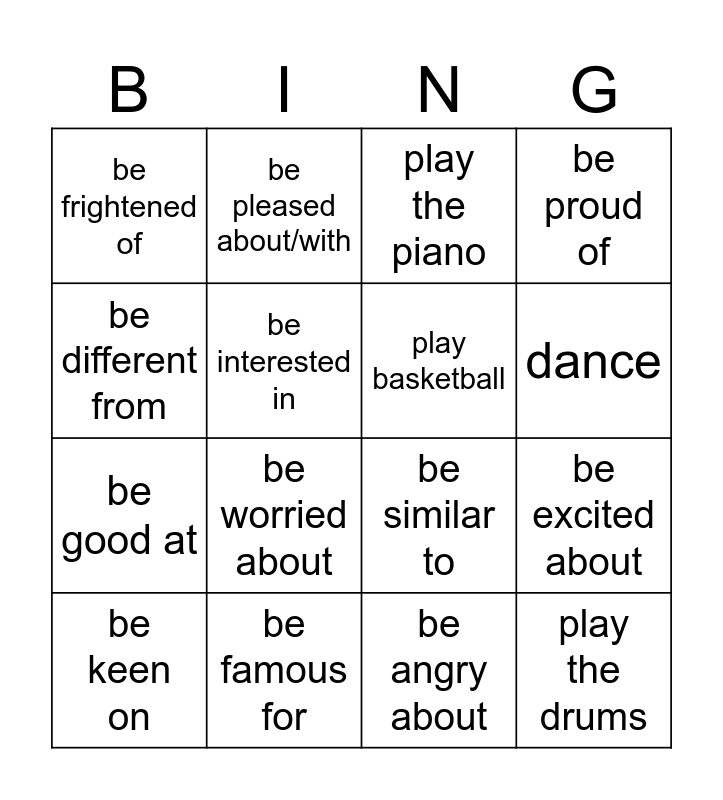 This bingo card has 16 words: be famous for, be excited about, play the piano, be frightened of, be good at, be pleased about/with, be similar to, be angry about, be different from, be interested in, be keen on, be proud of, be worried about, dance, play basketball and play the drums.