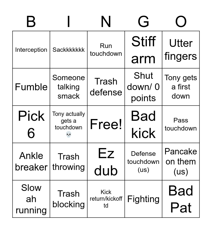 This bingo card has a free space and 24 words: Trash throwing, Trash blocking, Trash defense, Slow ah running, Utter fingers, Interception, Fumble, Sackkkkkkk, Bad kick, Ez dub, Shut down/ 0 points, Pick 6, Defense touchdown (us), Pancake on them (us), Someone talking smack, Fighting, Pass touchdown, Run touchdown, Tony gets a first down, Tony actually gets a touchdown💀, Bad Pat, Ankle breaker, Stiff arm and Kick return/kickoff td.