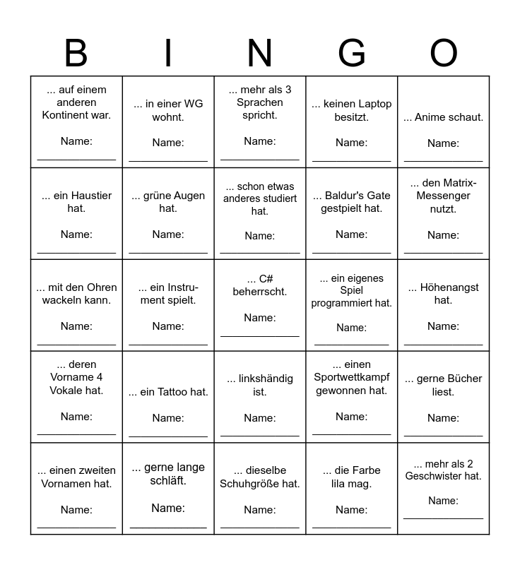 This bingo card has 30 words: ... gerne lange schläft. Name: ____________, ... im selben Monat wie du Geburtstag hat. Name: _____________, ... ein Instru- ment spielt. Name: _____________, ... die gleiche Sockenfarbe trägt. Name: _____________, ... auf einem anderen Kontinent war. Name: _____________, ... mehr als 3 Sprachen spricht. Name: _____________, ... grüne Augen hat. Name: _____________, ... linkshändig ist. Name: _____________, ... ein eigenes Spiel programmiert hat. Name: _____________, ... dieselbe Schuhgröße hat. Name: _____________, ... Höhenangst hat. Name: _____________, ... C# beherrscht. Name: _____________, ... die Farbe lila mag. Name: _____________, ... mehr als 2 Geschwister hat. Name: ______________, ... den Matrix-Messenger nutzt. Name: _____________, ... ein eigenes Auto hat. Name: _____________, ... einen Sportwettkampf gewonnen hat. Name: _____________, ... deren Vorname 4 Vokale hat. Name: _____________, ... ein Tattoo hat. Name: _____________, ... Anime schaut. Name: _____________, ... mit den Ohren wackeln kann. Name: _____________, ... einen 20-seitigen Würfel besitzt. Name: _____________, ... in einer WG wohnt. Name: _____________, ... Baldur's Gate gestpielt hat. Name: _____________, ... ein Haustier hat. Name: _____________, ... keinen Laptop besitzt. Name: _____________, ... gerne Bücher liest. Name: _____________, ... einen zweiten Vornamen hat. Name: _____________, ... schon etwas anderes studiert hat. Name: ______________ and ... mit einem Lehrer per Du ist/war. Name: ______________.