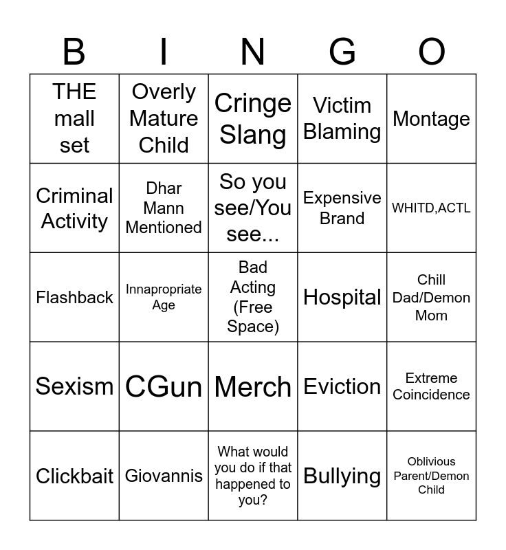 This bingo card has a free space and 38 words: Parking Lot Confrontation, PS5, Dhar Car, Dhar Mann Mentioned, Extreme Coincidence, CGun, So you see/You see..., Nickelodeon, Montage, Expensive Brand, Innapropriate Age, Victim Blaming, Oblivious Parent/Demon Child, Chill Dad/Demon Mom, Criminal Activity, Sexism, Sponsor, Cringe Slang, Problematic Lesson, Hospital, THE mall set, Giovannis, WHITD,ACTL, Clickbait, Divorce, What would you do if that happened to you?, Card Declines, Boring Video, Spaghetti, Walmart Celeb, Gaming, Merch, Bullying, Overly Mature Child, Poverty, Eviction, Flashback and Fired.