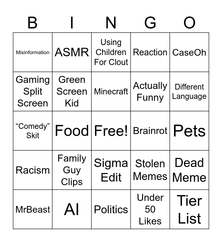 This bingo card has a free space and 24 words: Family Guy Clips, AI, Minecraft, MrBeast, CaseOh, Misinformation, Gaming Split Screen, ASMR, Brainrot, Sigma Edit, Actually Funny, “Comedy” Skit, Stolen Memes, Dead Meme, Green Screen Kid, Under 50 Likes, Pets, Using Children For Clout, Different Language, Food, Tier List, Racism, Reaction and Politics.