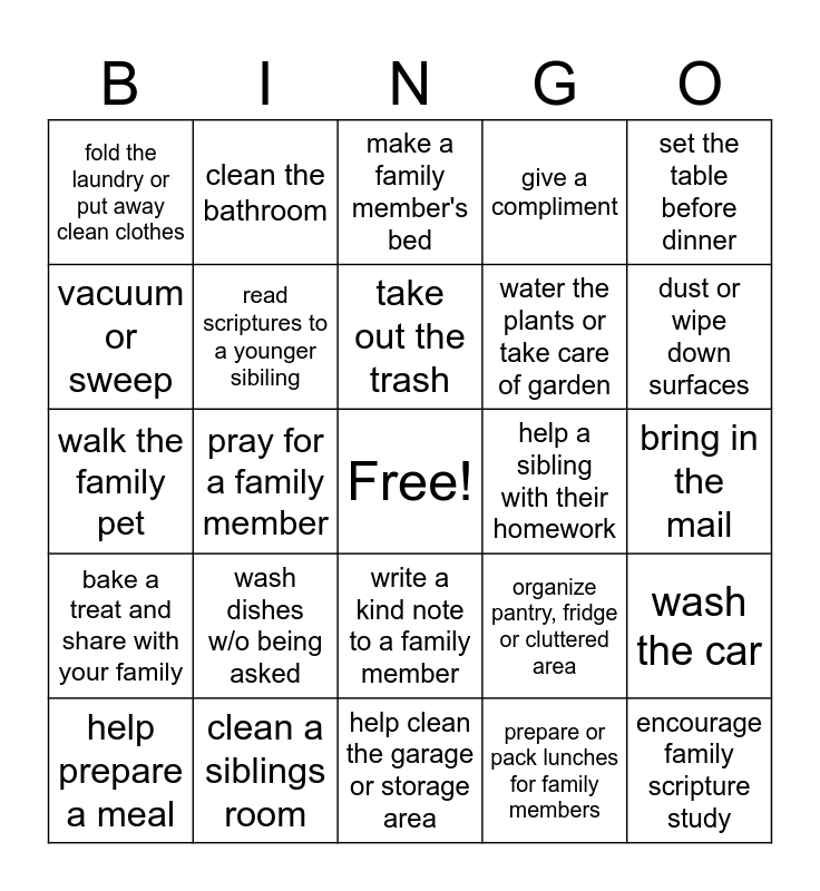 This bingo card has a free space and 24 words: wash dishes w/o being asked, clean a siblings room, take out the trash, help prepare a meal, set the table before dinner, fold the laundry or put away clean clothes, vacuum or sweep, clean the bathroom, help a sibling with their homework, write a kind note to a family member, water the plants or take care of garden, walk the family pet, organize pantry, fridge or cluttered area, wash the car, read scriptures to a younger sibiling, prepare or pack lunches for family members, bring in the mail, make a family member's bed, dust or wipe down surfaces, pray for a family member, encourage family scripture study, bake a treat and share with your family, give a compliment and help clean the garage or storage area.