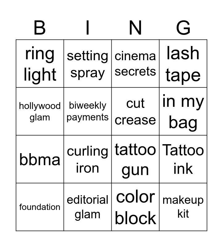 This bingo card has 1 images and 44 words: foundation, concealer, bobby pin, lash tweezer, lipstick, cinema secrets, color theory, hollywood glam, flat iron, lash tape, editorial glam, brushes, boss babe, gel pads, lipgloss, beauty school, tattoo gun, micro bundle, curling iron, setting spray, hair extensions, spool brush, ring light, primer, color block, vanity, weekly payments, blush, makeup kit, metal spatula, sanitation, cleanser, lash tray, Barbicide, Tattoo ink, rat tail comb, hollywood waves, bridal, in my bag, biweekly payments, bbma, eyeshadow palette, cut crease and late fees.