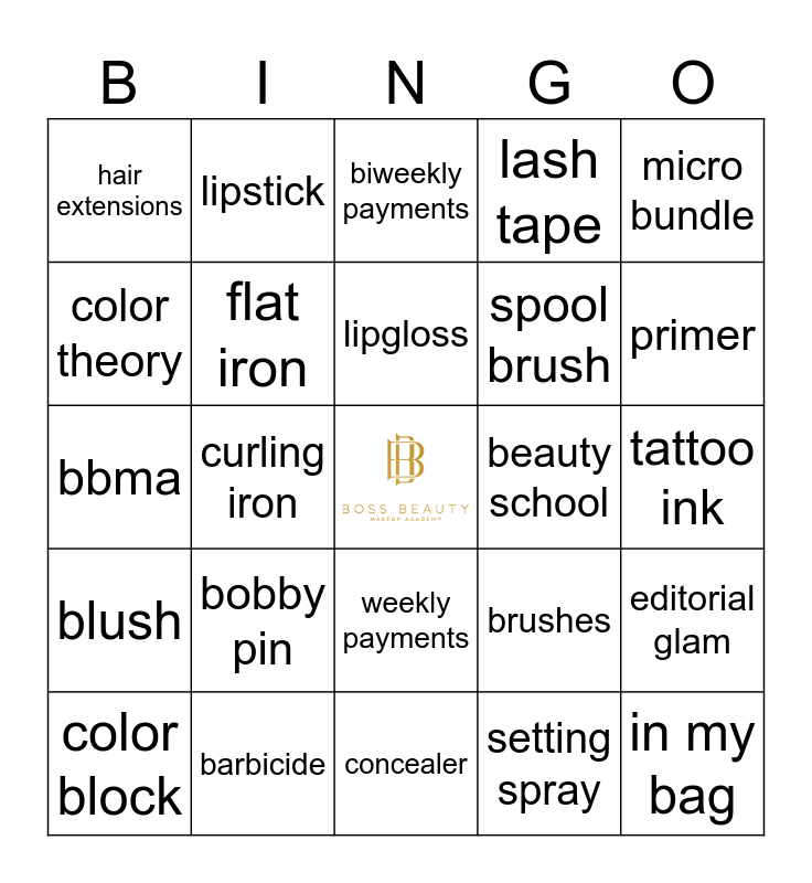 This bingo card has 1 images and 45 words: Free!, foundation, concealer, bobby pin, lash tweezer, lipstick, cinema secrets, color theory, hollywood glam, flat iron, lash tape, editorial glam, brushes, boss babe, gel pads, lipgloss, beauty school, tattoo gun, micro bundle, curling iron, setting spray, hair extensions, spool brush, ring light, primer, color block, vanity, weekly payments, blush, makeup kit, metal spatula, sanitation, cleanser, lash tray, barbicide, tattoo ink, rat tail comb, hollywood waves, bridal, in my bag, biweekly payments, bbma, eyeshadow palette, cut crease and late fees.