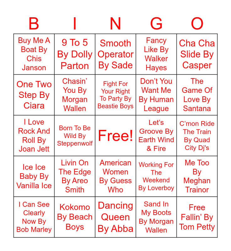 This bingo card has a free space and 24 words: Livin On The Edge By Areo Smith, Kokomo By Beach Boys, Fight For Your Right To Party By Beastie Boys, I Can See Clearly Now By Bob Marley, Cha Cha Slide By Casper, Buy Me A Boat By Chis Janson, One Two Step By Ciara, 9 To 5 By Dolly Parton, Let’s Groove By Earth Wind & Fire, American Women By Guess Who, Don’t You Want Me By Human League, I Love Rock And Roll By Joan Jett, Working For The Weekend By Loverboy, Me Too By Meghan Trainor, Chasin’ You By Morgan Wallen, Sand In My Boots By Morgan Wallen, C’mon Ride The Train By Quad City Dj's, Smooth Operator By Sade, The Game Of Love By Santana, Born To Be Wild By Steppenwolf, Free Fallin’ By Tom Petty, Ice Ice Baby By Vanilla Ice, Fancy Like By Walker Hayes and Dancing Queen By Abba.