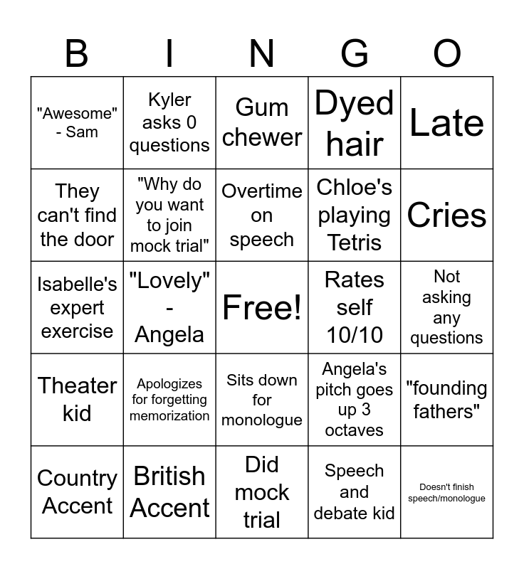 This bingo card has a free space and 29 words: Country Accent, Thank you for coming in on a [weekday] [time], "Lovely" - Angela, "Awesome" - Angela, "Awesome" - Sam, Gum chewer, "Why do you want to join mock trial", Apologizes for forgetting memorization, Rates self 10/10, British Accent, Not asking any questions, Doesn't finish speech/monologue, Did mock trial, Speech and debate kid, Cries, Wears suit, Sits down for monologue, Theater kid, Late, Isabelle's expert exercise, Angela's pitch goes up 3 octaves, Isabelle's on Amazon, Chloe's playing Tetris, They can't find the door, Dyed hair, Kyler asks 0 questions, "founding fathers", Overtime on speech and Some rando in the building wants to talk to us.