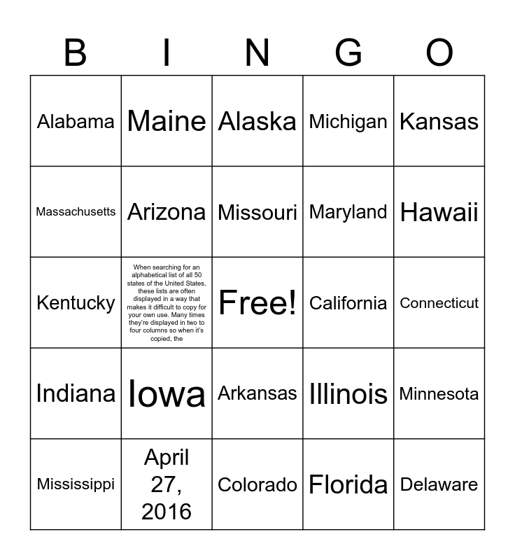 This bingo card has a free space and 30 words: April 27, 2016, alphabetical list of states, When searching for an alphabetical list of all 50 states of the United States, these lists are often displayed in a way that makes it difficult to copy for your own use. Many times they’re displayed in two to four columns so when it’s copied, the, Alphabetical List of All 50 States, Alabama, Alaska, Arizona, Arkansas, California, Colorado, Connecticut, Delaware, Florida, Georgia, Hawaii, Idaho, Illinois, Indiana, Iowa, Kansas, Kentucky, Louisiana, Maine, Maryland, Massachusetts, Michigan, Minnesota, Mississippi, Missouri and Montana.